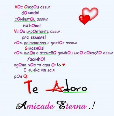 só vim aqui pra te dizer que adoro entrar na internet e ficar teclando com você horas, e horas .. sabe nossa amizade se tornou uma GRANDE AMIZADE VIRTUAL. ♥
